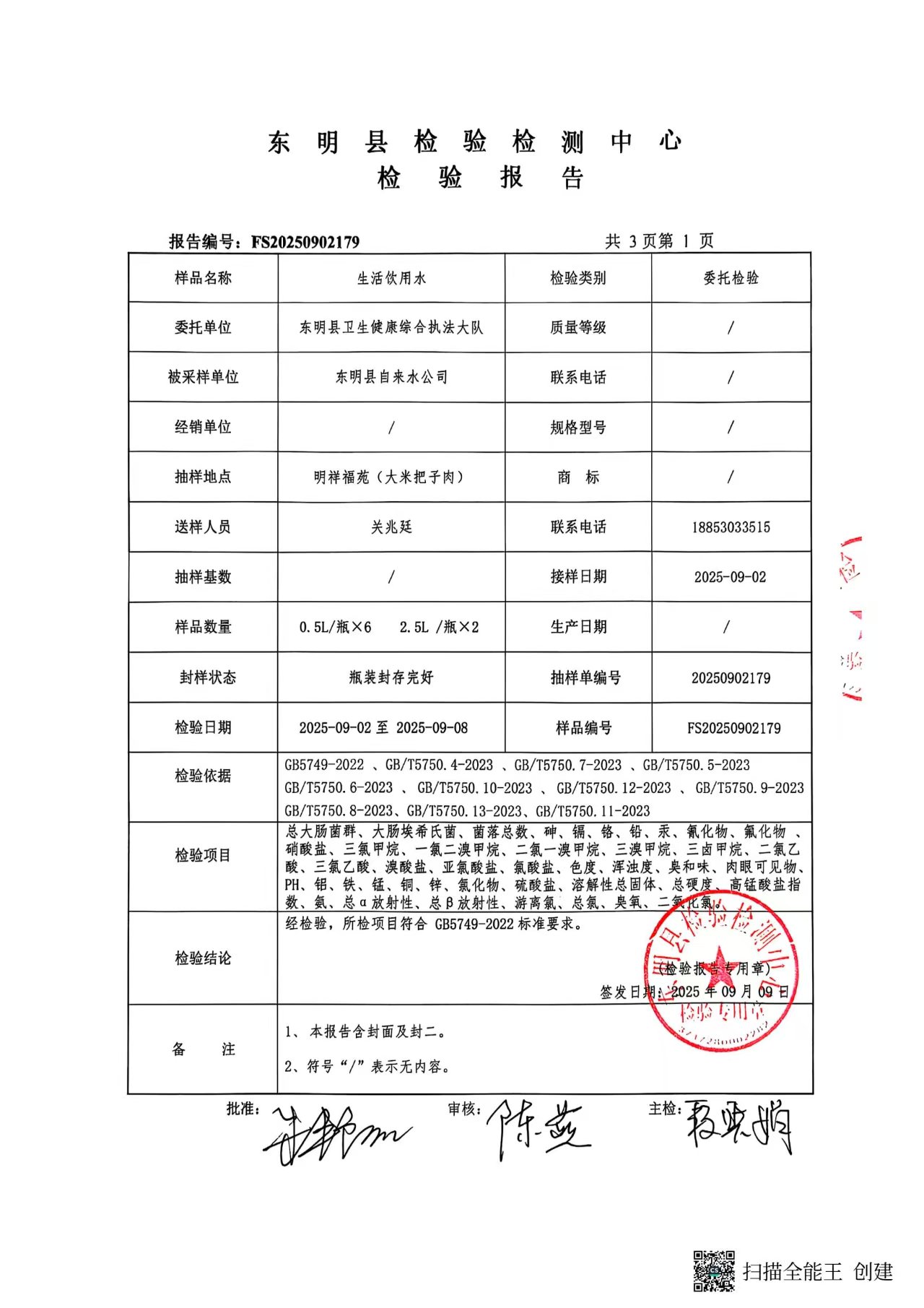 2025年第三季度管网末梢水检测明祥福苑大米把子肉取水口(季检)