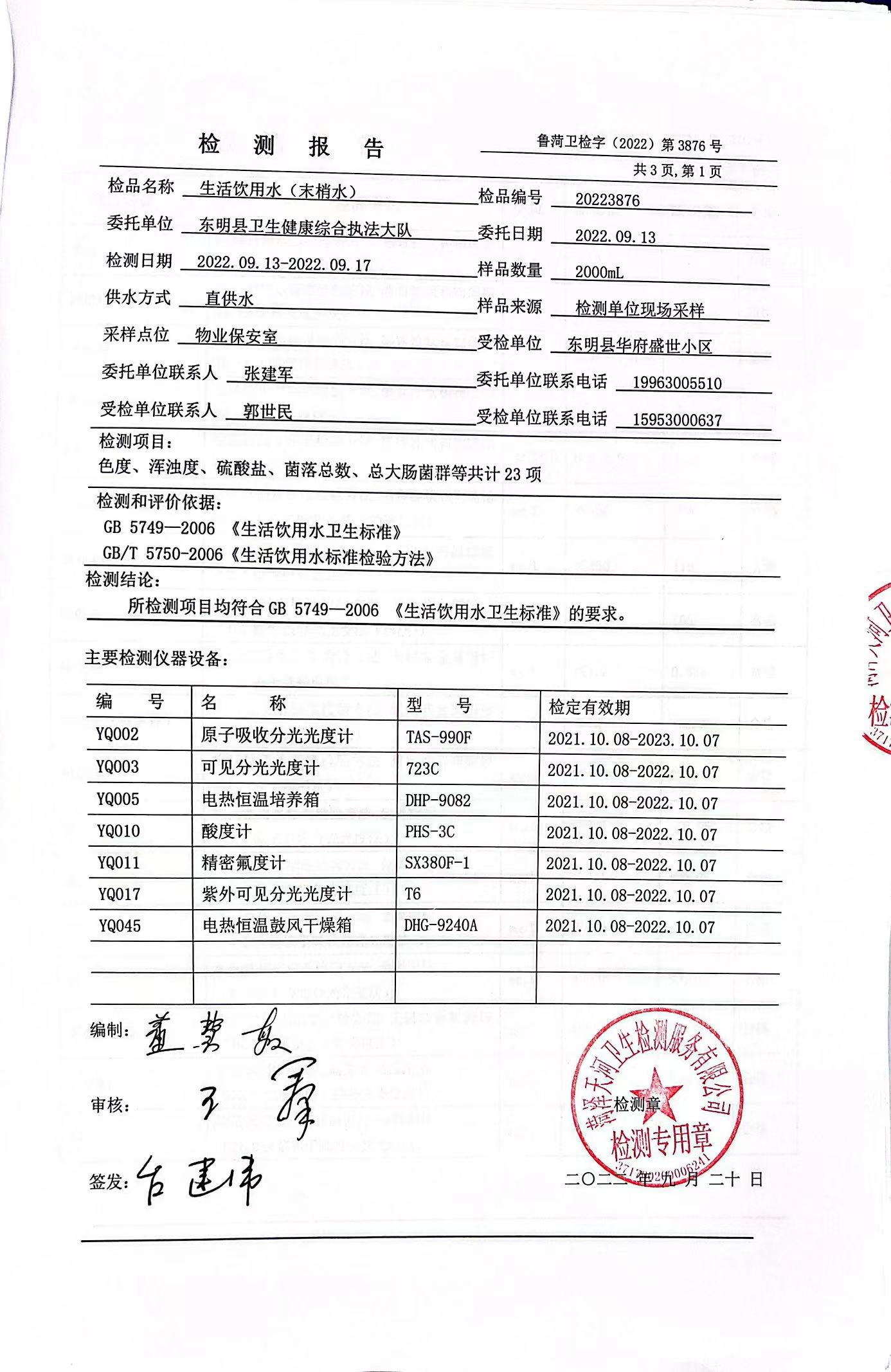 2022年第三季度官网末梢水检测华府盛世取水口(季检)