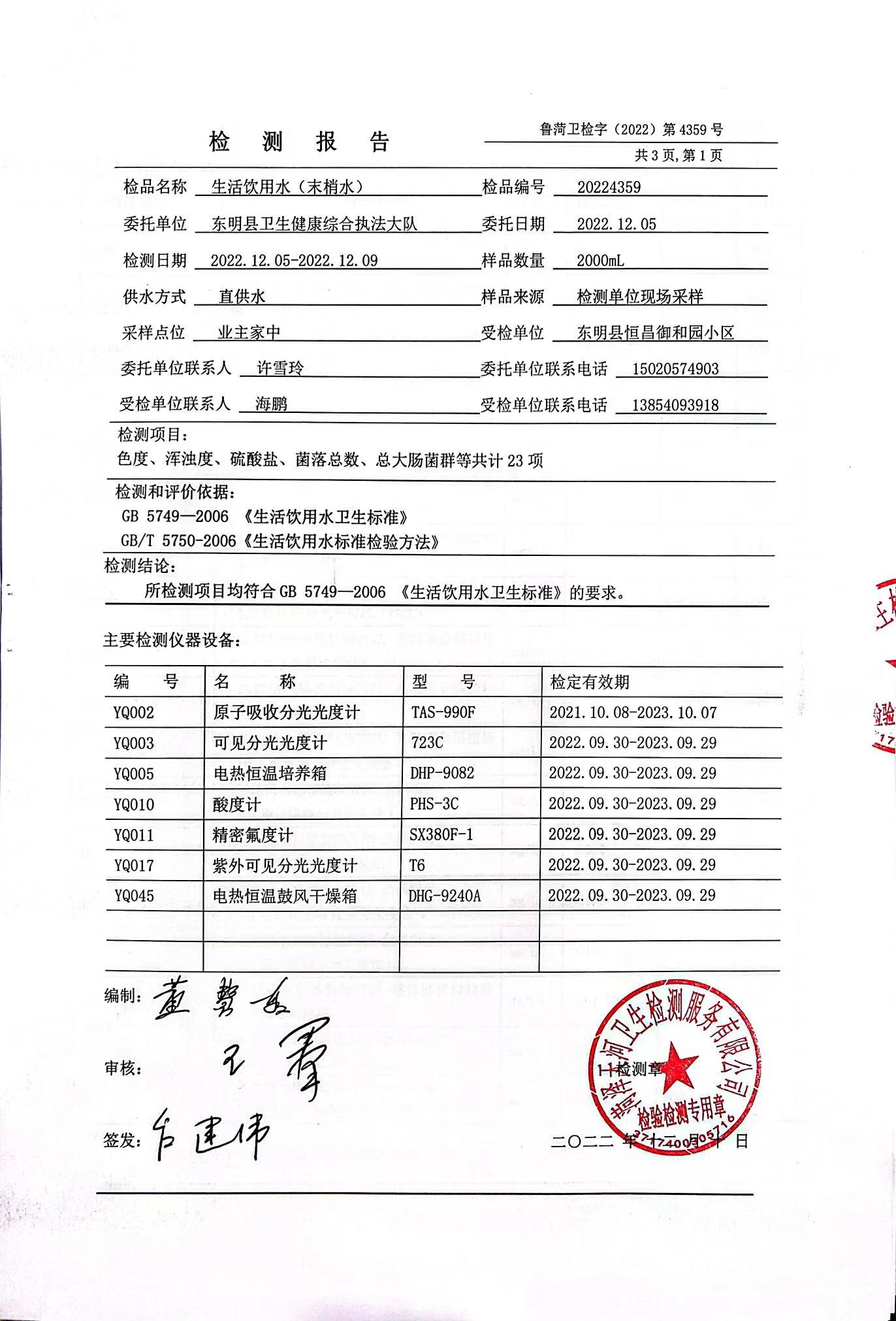 2022年第四季度官网末梢水检测恒昌御和园小区取水口(季检)