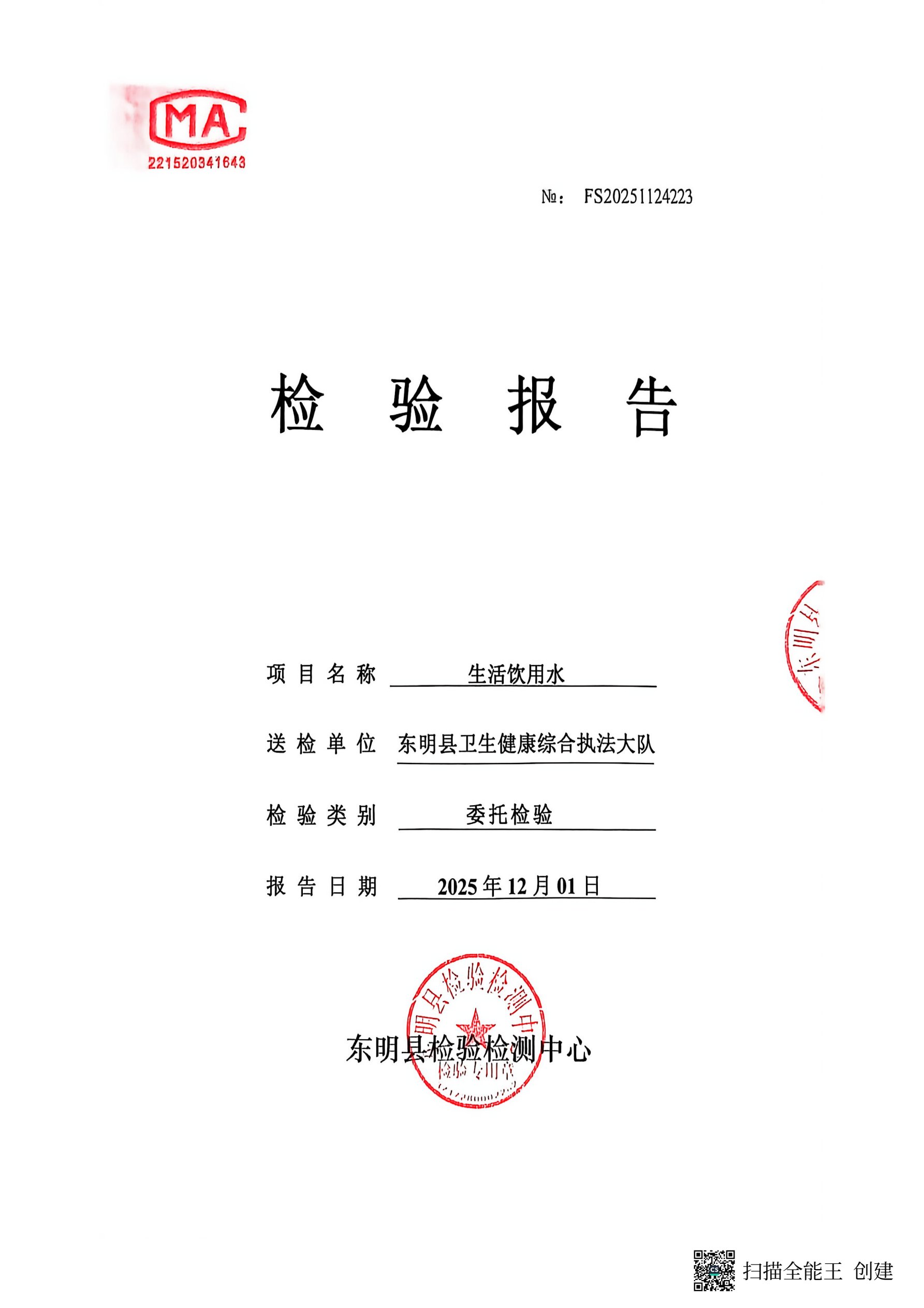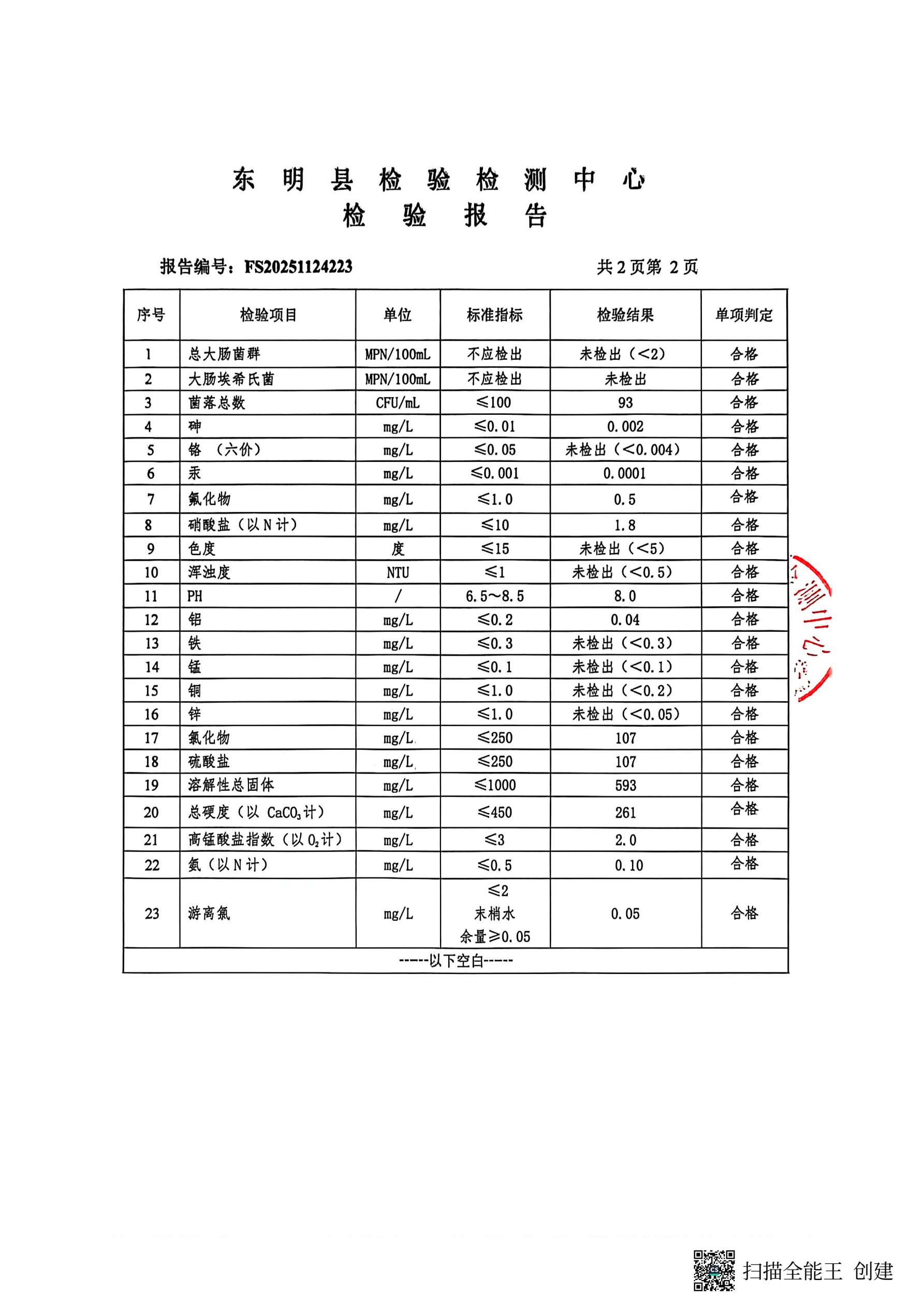 2025年第四季度管网末梢水检测龙泉璟苑C区取水口(季检)